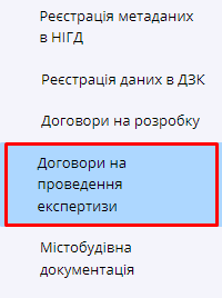 Для початку роботи з цим інтерфейсом користувачу необхідно перейти до електронного кабінету Замовника містобудівної документації та у ньому перейти до розділу під назвою “Договори на проведення експертизи” (Рисунок 76). Важливо, що документ договір на проведення експертизи також має бути підписаний КЕП Експертизи містобудівної документації.