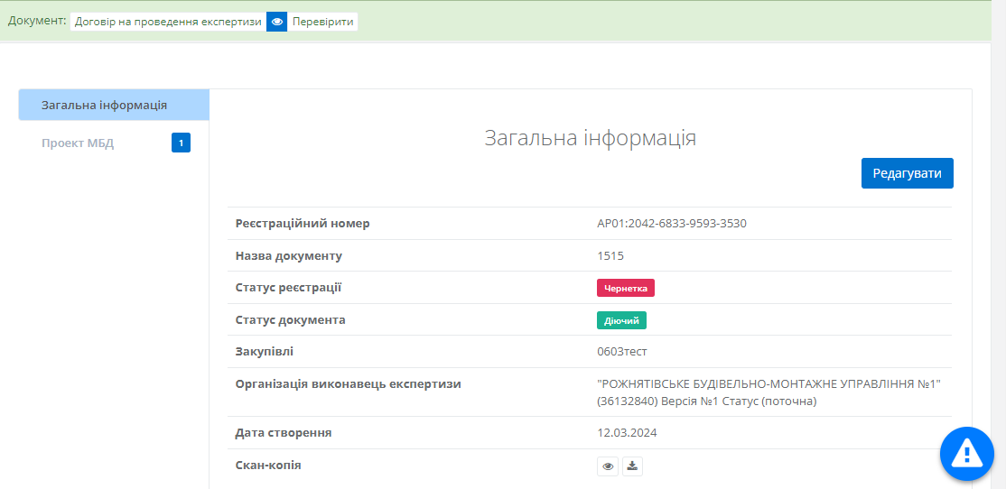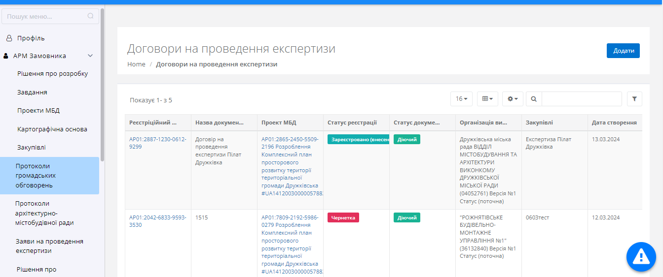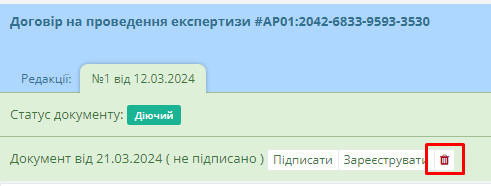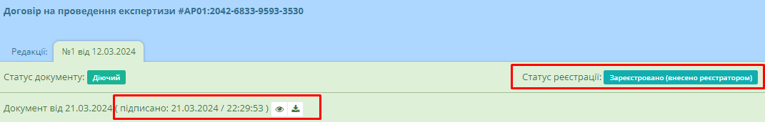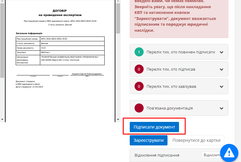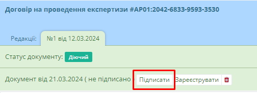 Після підписання договору Замовником, його має підписати власним КЕП Експертиза містобудівної документації. Функція реєстрації документу буде доступна лише після цього.