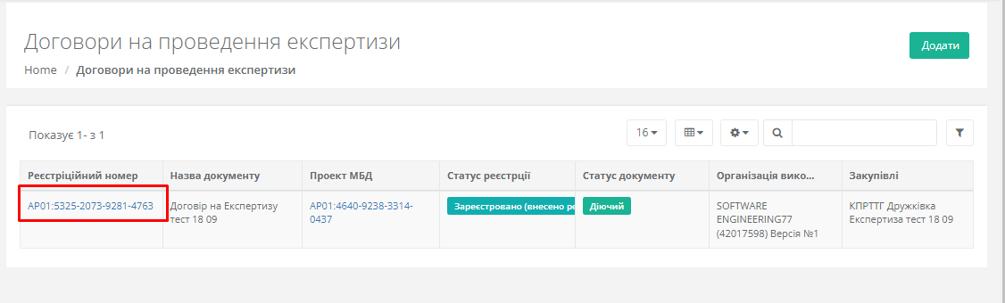 Після створення документу та натиснення кнопки “Зберегти”, система автоматично перемістить користувача в реєстр створених договорів на проведення експертизи.
