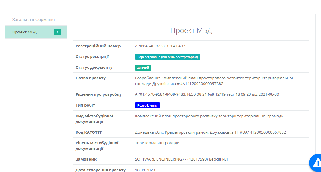 За потреби користувач може перейти до картки проекту МБД, натиснувши на його реєстраційний номер який виділений синім кольором.
