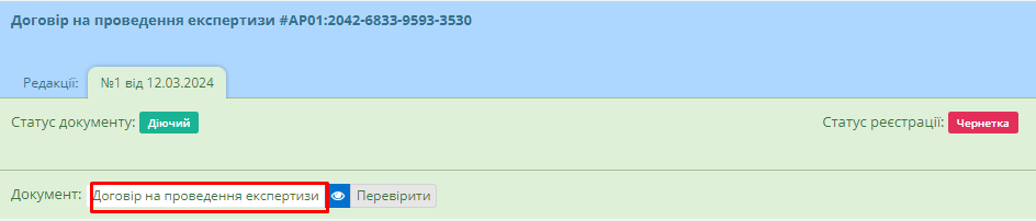 У картці документу, в реєстрі “Договори на проведення експертизи” користувачу доступні наступні вкладки: