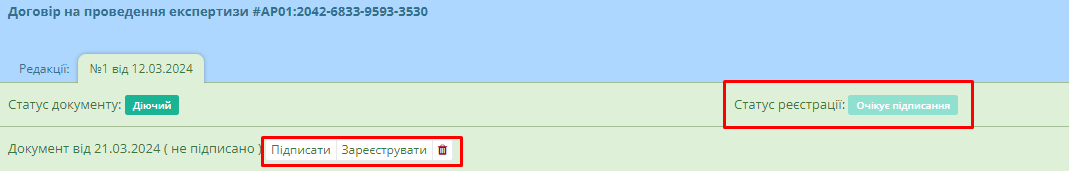 Після цього документ отримає статус “Очікує підписання” та водночас користувачу стануть доступні кнопки підписання та реєстрації документу (Рисунок 87):