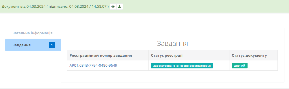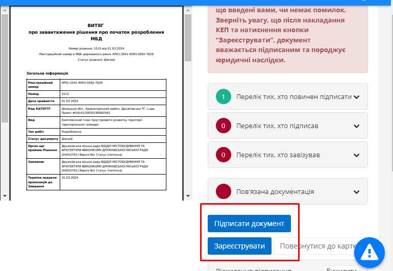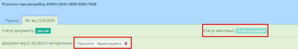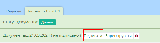 Після цього документ отримає статус “Очікує підписання” та водночас користувачу стануть доступні кнопки підписання та реєстрації документу (Рисунок 9):