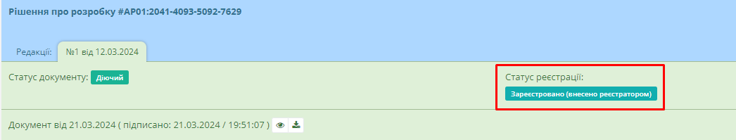 За результатами підписання та реєстрації документ отримує статус “Зареєстровано (внесено реєстратором)” (Рисунок 15):