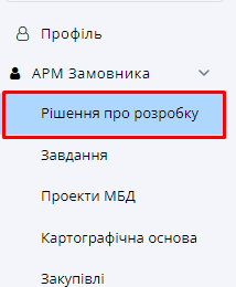 Для того щоб потрапити у реєстр рішень про розробку містобудівної документації, користувачу необхідно перейти у розділ електронного кабінету Замовника містобудівної документації “Рішення про розробку”. Меню кабінету має наступний вигляд (Рисунок 1):