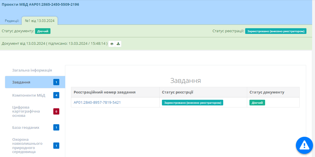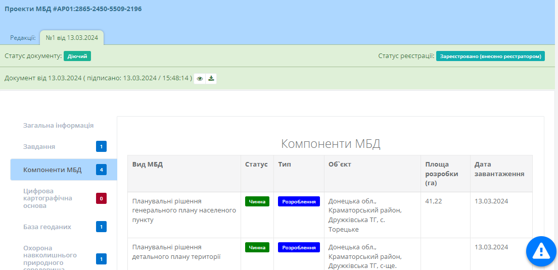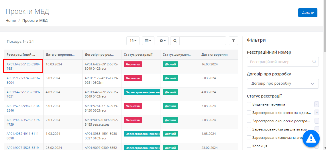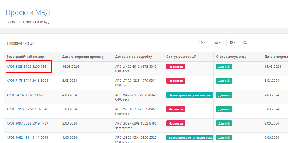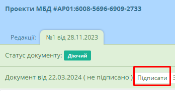 Для підписання проекту МБД, користувачу необхідно перейти в картку відповідного проекту МБД. Для цього необхідно лівою клавішею миші натиснути на “Реєстраційний номер”, який підсвічено синім (Рисунок 287):