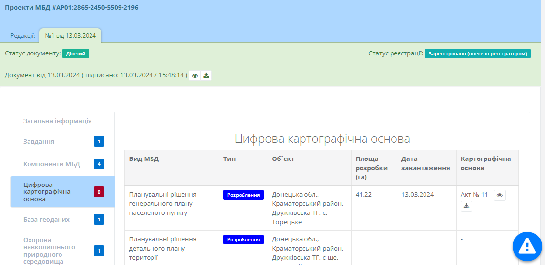 Вкладка містить відомості про цифрову картографічну основу проекту МБД (Рисунок 270):