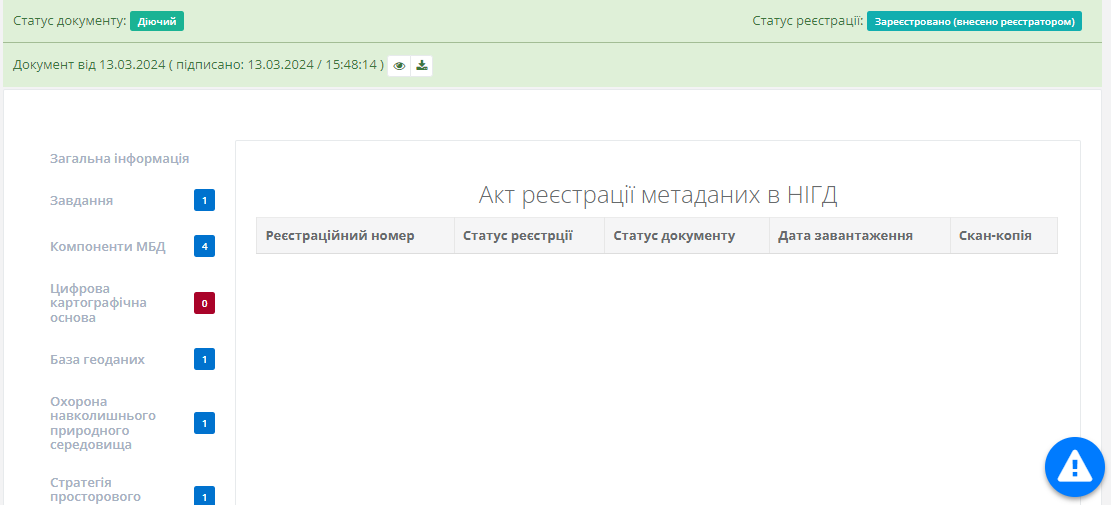 Вкладка “Акт реєстрації метаданих в НІГД”