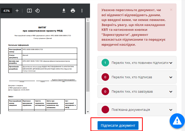 Після ознайомлення із документом, користувач має його підписати. Для цього необхідно натиснути на кнопку “Підписати документ” (Рисунок 289).