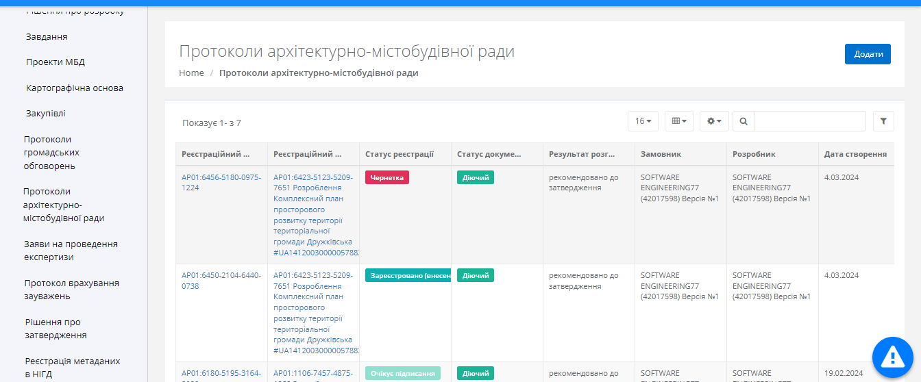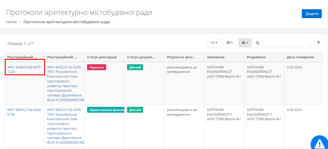 Після створення документу та натиснення кнопки “Зберегти”, система автоматично перемістить користувача в реєстр створених протоколів архітектурно-містобудівної ради. Знайшовши необхідний протокол, користувач має перейти до картки договору на розробку.