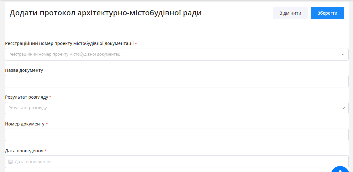 | 1 | Реєстраційний номер проекту містобудівної документації | випадаючий список |