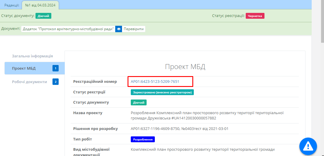За потреби користувач може перейти до картки проекту МБД, натиснувши на його реєстраційний номер який виділений синім кольором.