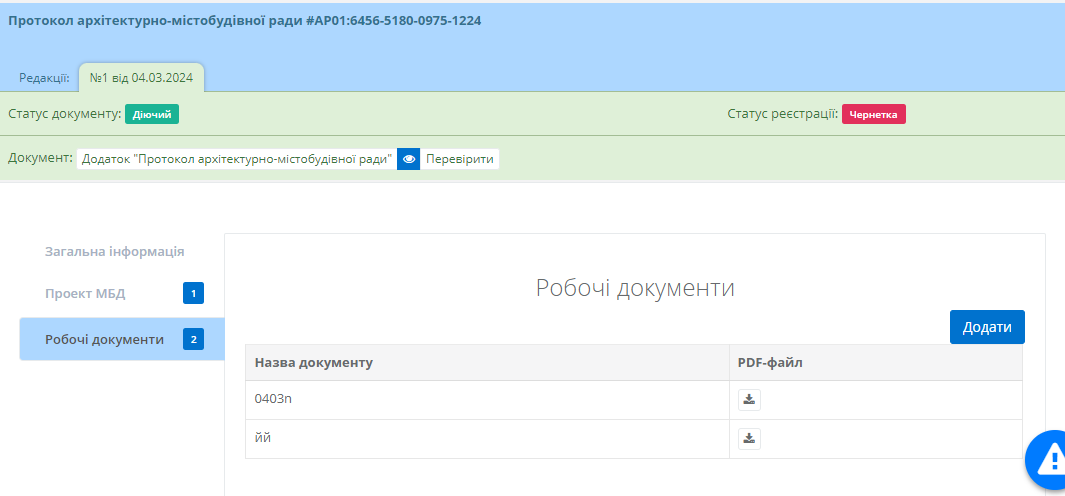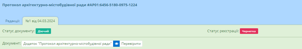 Вкладка містить відомості про робочі документи, які безпосередньо стосуються протоколу архітектурно-містобудівної ради (Рисунок 118):