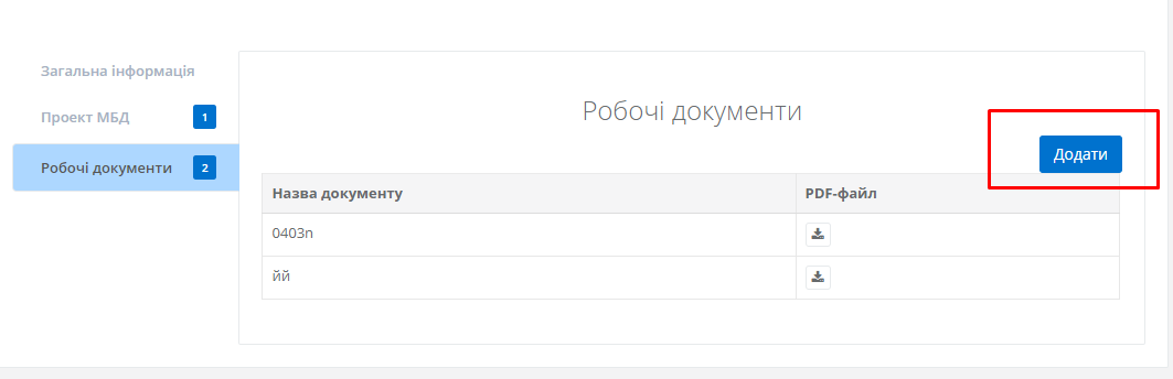 Для додавання нових робочих документів користувачу необхідно натиснути на кнопку “Додати” , яка знаходиться у верхній вкладки (Рисунок 119).