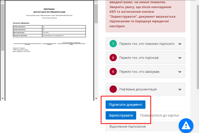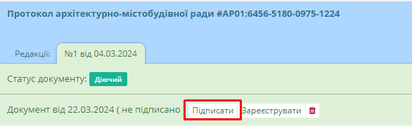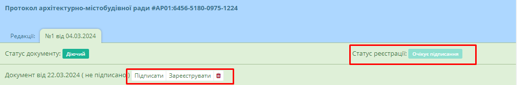 Після цього документ отримає статус “Очікує підписання” та водночас користувачу стануть доступні кнопки підписання та реєстрації документу (Рисунок 123):
