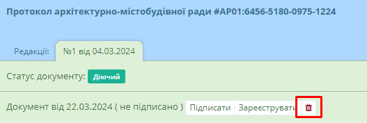 Для видалення дії, користувачу необхідно натиснути на кнопку вилучення, яка знаходиться у верхній частині картки (Рисунок 124)
