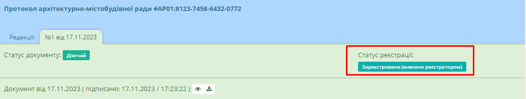 За результатами підписання та реєстрації документ отримує статус “Зареєстровано (внесено реєстратором)” (Рисунок 129):