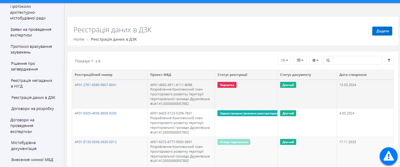 Додавання акту реєстрації даних в ДЗК
