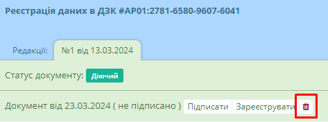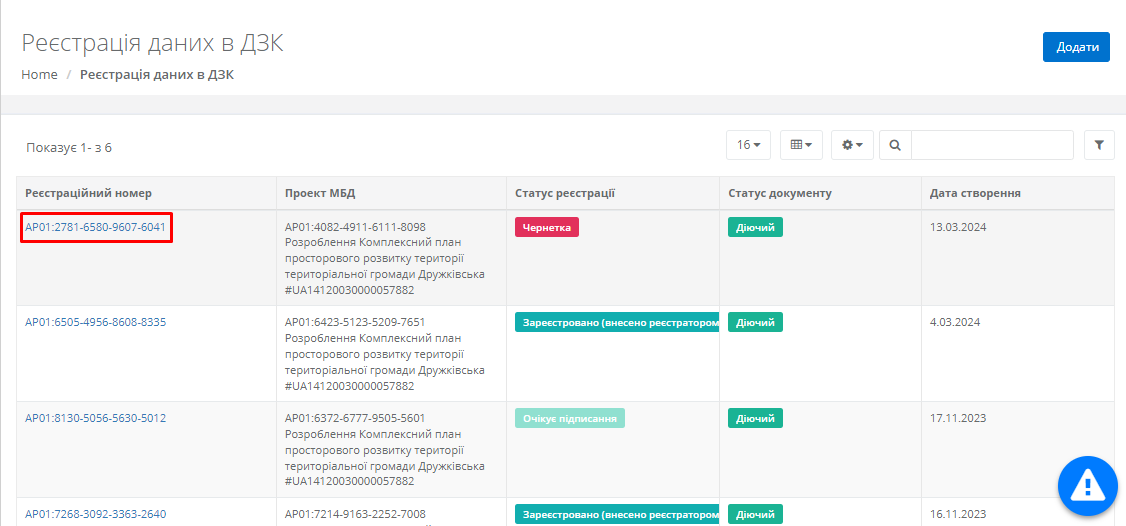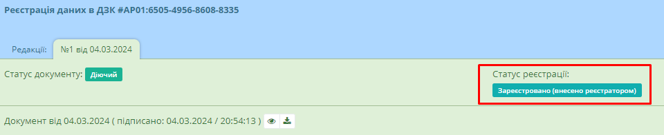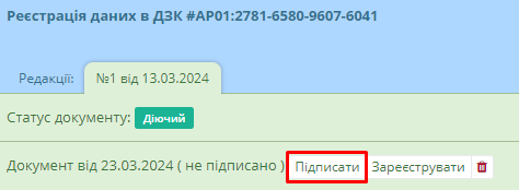 Після створення документу та натиснення кнопки “Зберегти”, система автоматично перемістить користувача в реєстр реєстрації даних в ДЗК. Знайшовши необхідний документ, користувач має перейти до його картки.