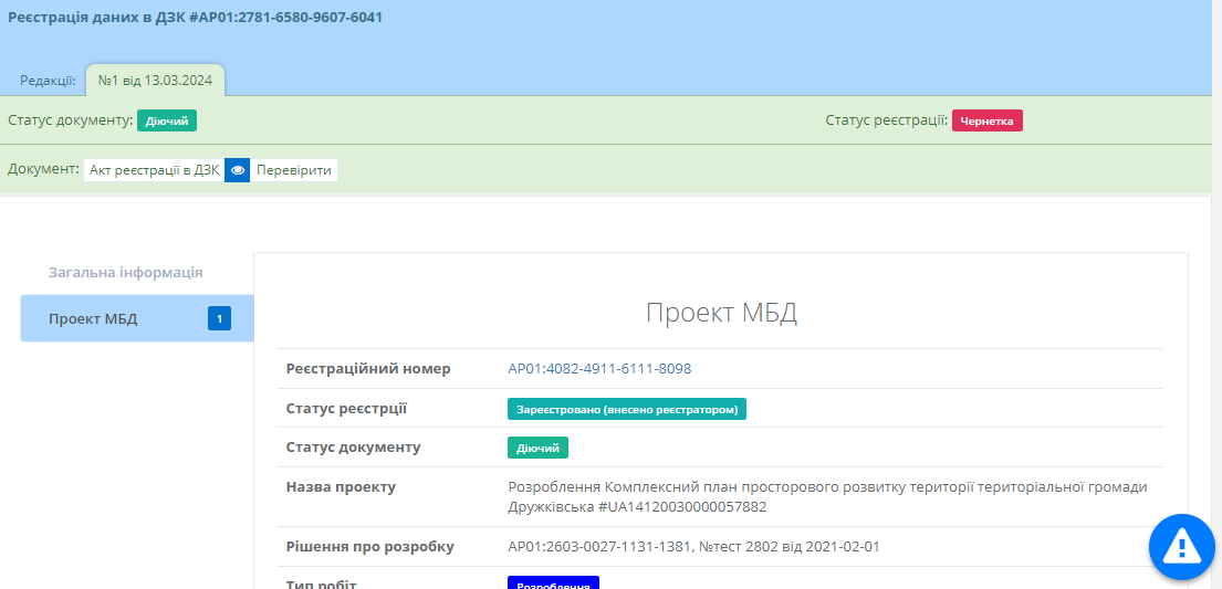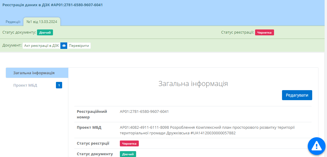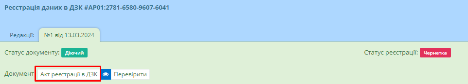 Картка акту реєстрації даних в ДЗК виглядає подібним чином (Рисунок 224), загальну інформацію також можна редагувати натиснувши на однойменну кнопку у верхній частині картки.