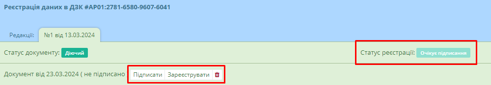 Після цього документ отримає статус “Очікує підписання” та водночас користувачу стануть доступні кнопки підписання та реєстрації документу (Рисунок 228):