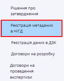 Для того щоб провести реєстрацію метаданих містобудівної документації в НІГД користувачу необхідно авторизуватись в електронному кабінеті Замовника містобудівної документації та у ньому перейти до розділу під назвою “Реєстрація метаданих в НІГД” (Рисунок 205).