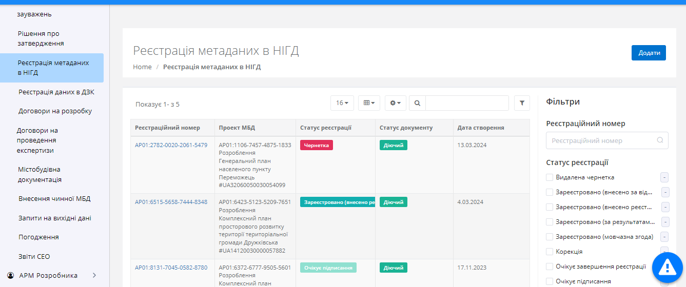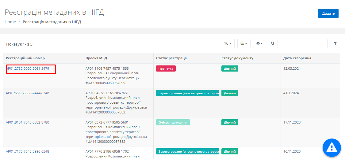 Після створення документу та натиснення кнопки “Зберегти”, система автоматично перемістить користувача в реєстр реєстрації метаданих в НІГД. Знайшовши необхідний документ, користувач має перейти до його картки.