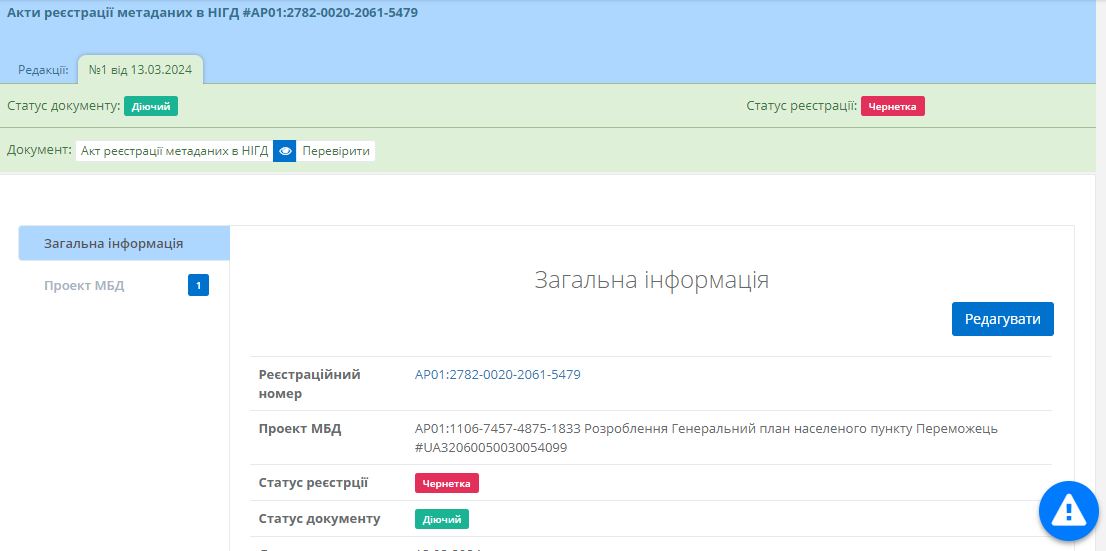 Картка акту реєстрації метаданих в НІГД виглядає подібним чином (Рисунок 209), загальну інформацію також можна редагувати натиснувши на однойменну кнопку у верхній частині картки.