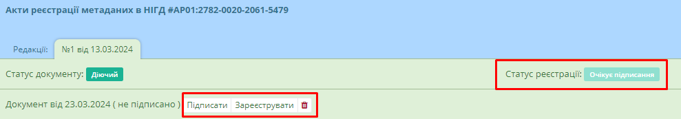Після цього документ отримає статус “Очікує підписання” та водночас користувачу стануть доступні кнопки підписання та реєстрації документу (Рисунок 213):