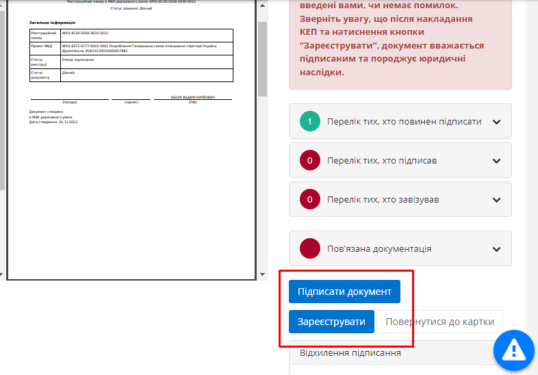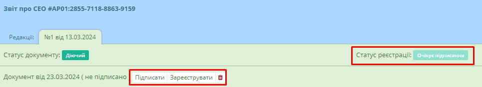 Після цього документ отримає статус “Очікує підписання” та водночас користувачу стануть доступні кнопки підписання та реєстрації документу (Рисунок 244):