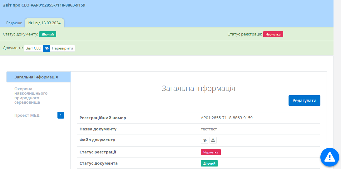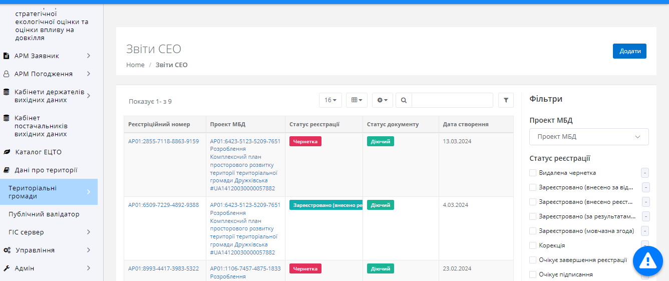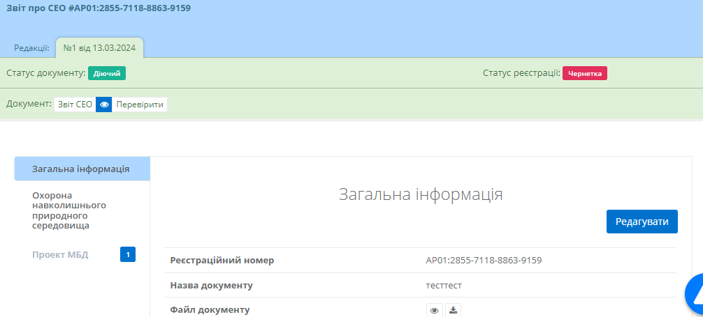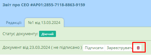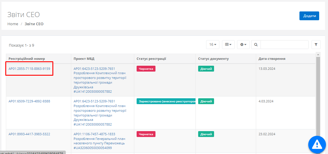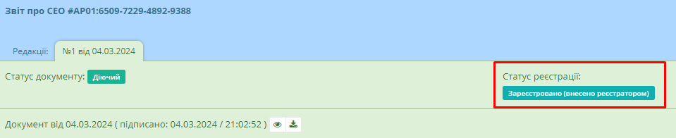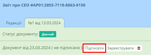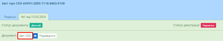 Після створення документу та натиснення кнопки “Зберегти”, система автоматично перемістить користувача в реєстр звітів СЕО. Знайшовши необхідний документ, користувач має перейти до його картки.