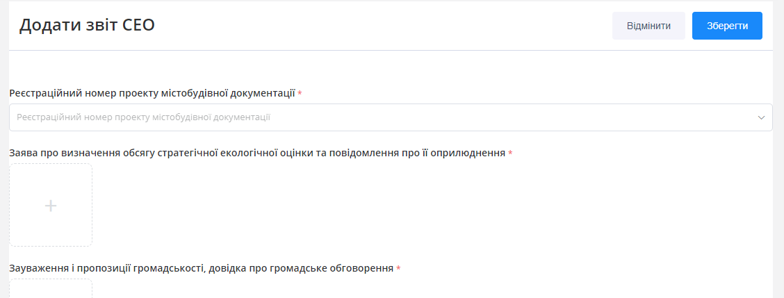 Для додання нового звіту СЕО користувачу необхідно натиснути на кнопку , яка знаходиться у верхній частині реєстру. Після чого користувачу відкриється форма додавання нового документу (Рисунок 237):