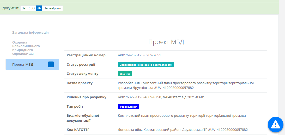 За потреби користувач може перейти до картки проекту МБД, натиснувши на його реєстраційний номер який виділений синім кольором.