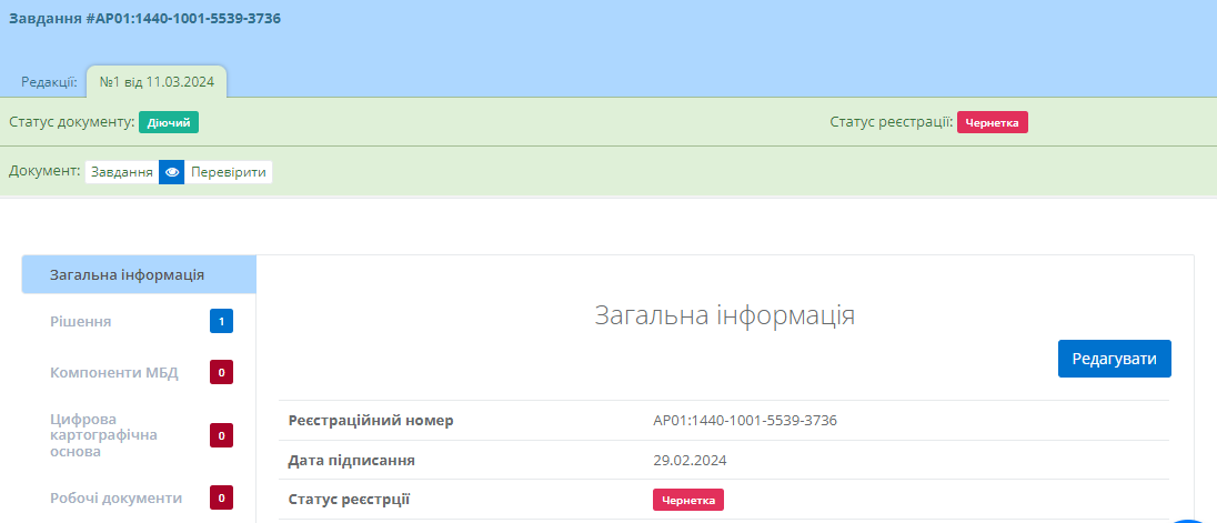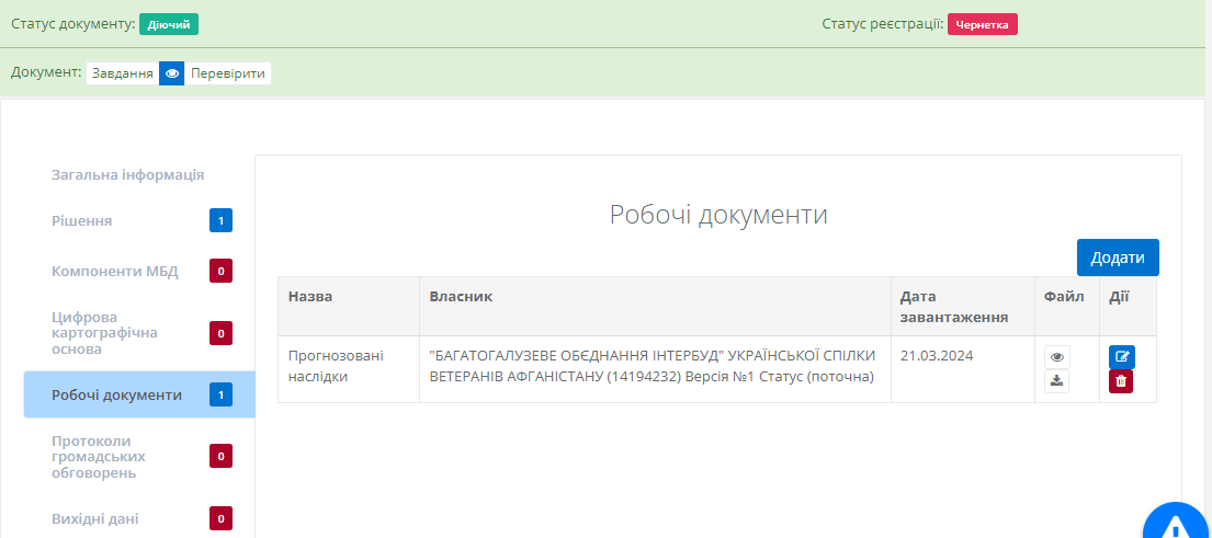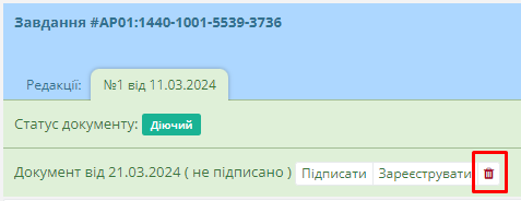 Після чого новий робочий документ буде додано до таблиці. За потреби користувач до моменту підписання завдання може редагувати або видалити внесені відомості натиснувши відповідні кнопки