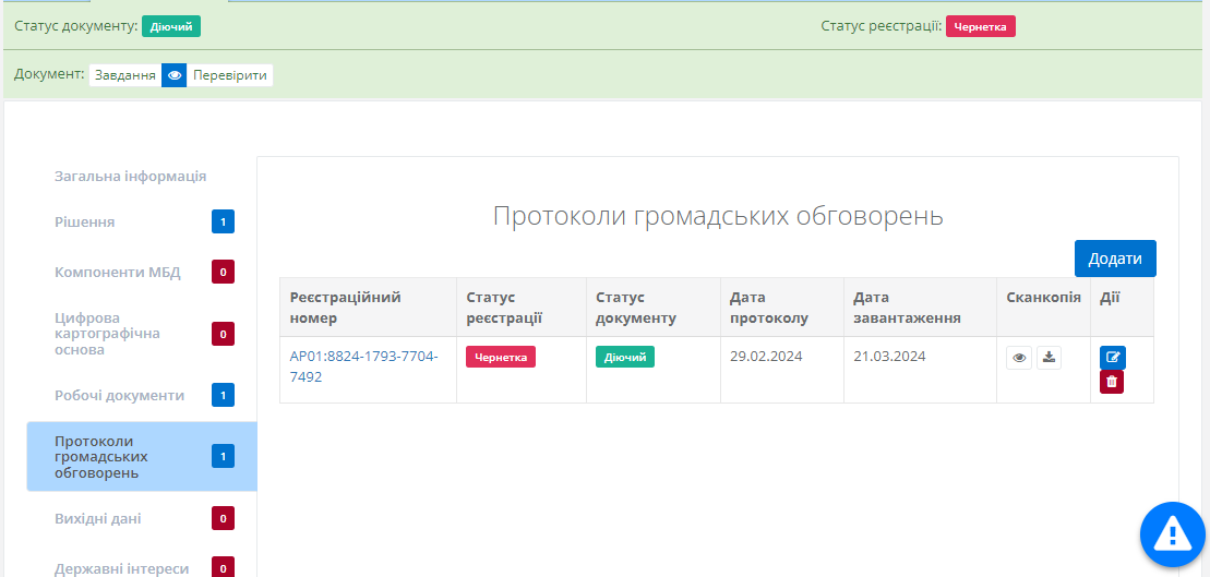 Після чого новий протокол в статусі “Чернетка” буде додано до таблиці.