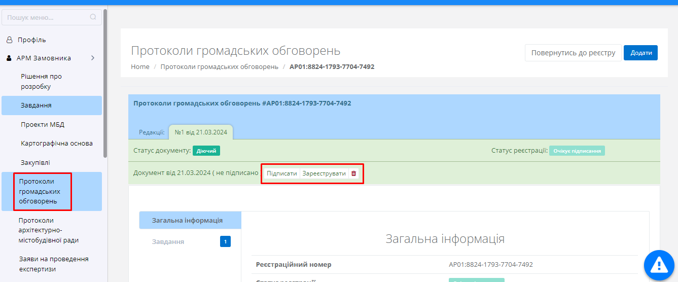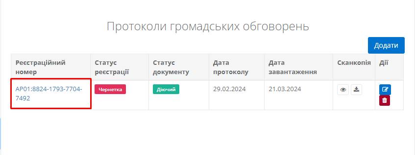 Після цього необхідно натиснути на реєстраційний номер протоколу та перейти в інтерфейс “Протоколи громадських обговорень” (Рисунок 33):