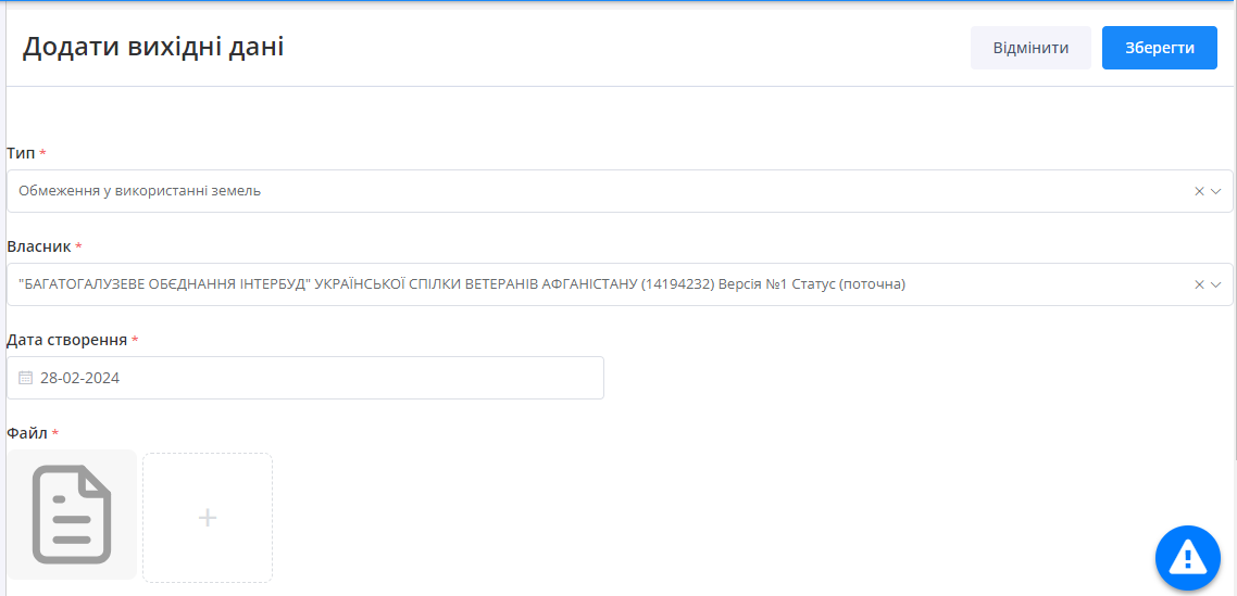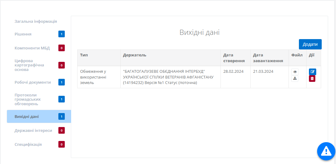 Після чого нові Вихідні дані буде додано до таблиці. За потреби користувач до моменту підписання документу може редагувати або видалити внесені відомості натиснувши відповідні кнопки