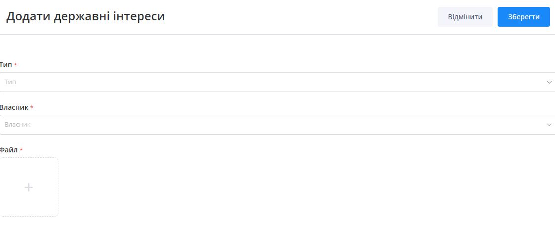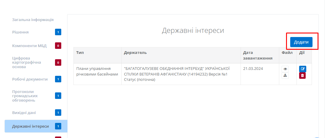 Користувач має можливість додавати нові державні інтереси. Для цього необхідно натиснути на кнопку “Додати”, яка знаходиться у верхній частині.