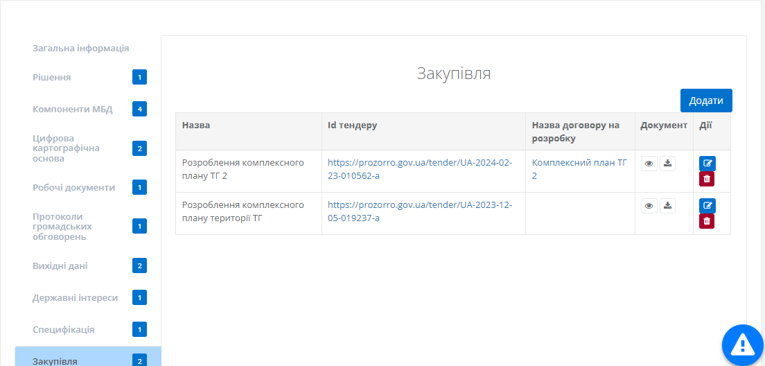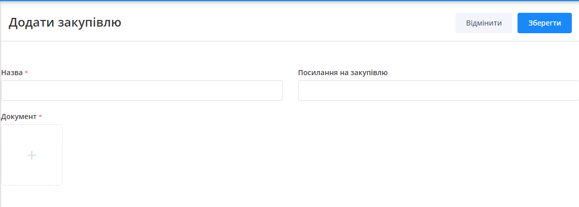 Користувач має можливість додати нову закупівлю. Для цього необхідно натиснути на кнопку “Додати”, яка знаходиться у верхній частині.