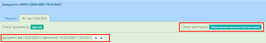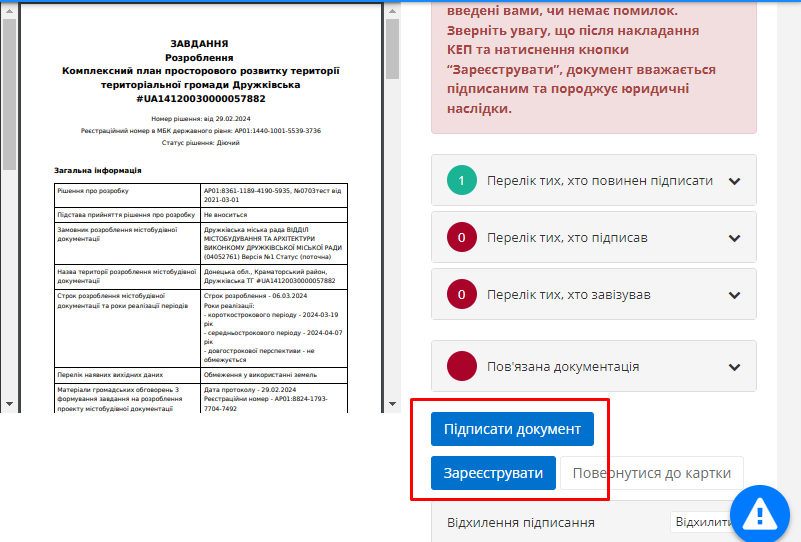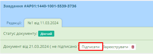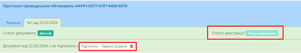 Після цього документ отримає статус “Очікує підписання” та водночас користувачу стануть доступні кнопки підписання та реєстрації документу (Рисунок 45):