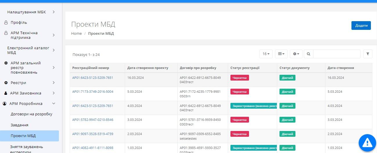 Після переходу до реєстру користувачу буде доступна табличка із проектами МБД (Рисунок 22)