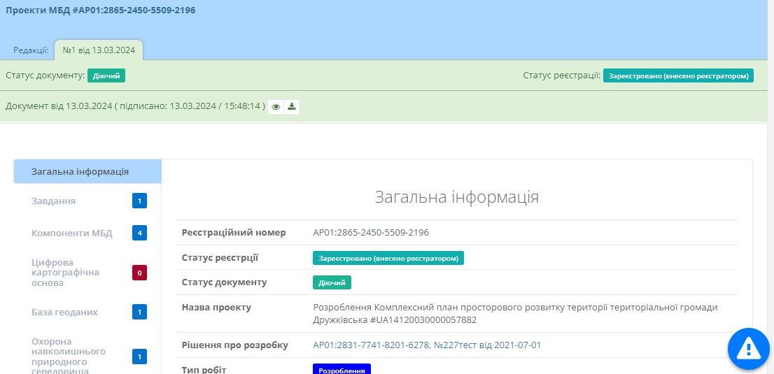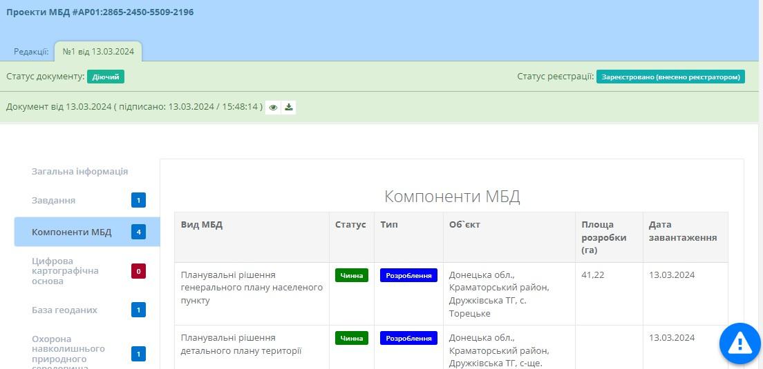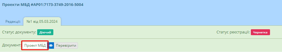 Після створення документу та натиснення кнопки “Зберегти”, система автоматично перемістить користувача в реєстр проектів МБД. Знайшовши необхідний документ, користувач має перейти до його картки.