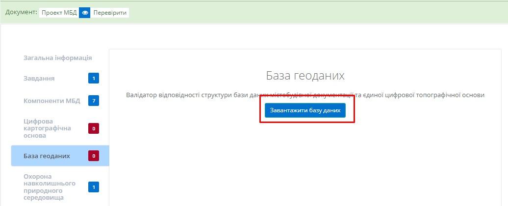 Для початку проведення процесу валідації геоданих містобудівної документації необхідно натиснути кнопку “Завантажити базу геоданих” (Рисунок 29):