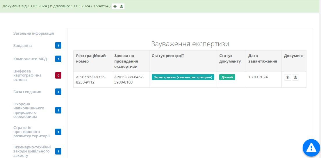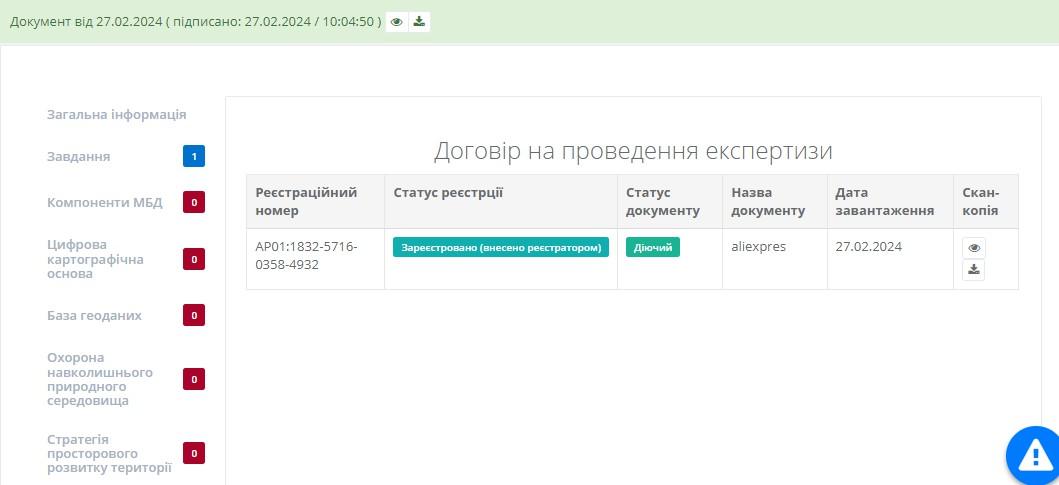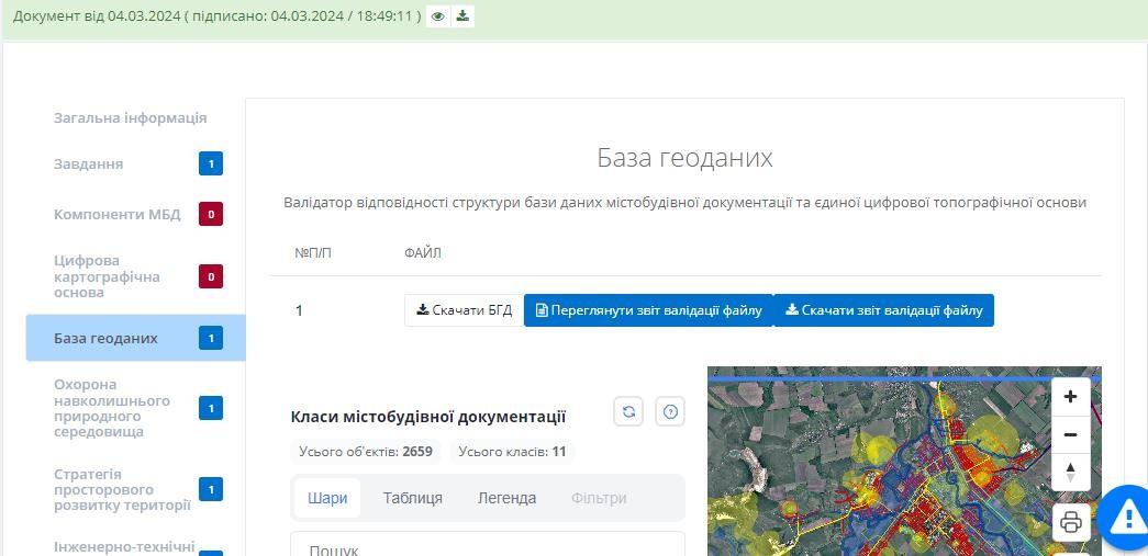Після проведення валідації користувача автоматично буде переміщено в картку проекта МБД, де він зможе переглянути результати валідації бази геоданих.