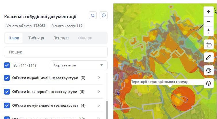 Блок класів містобудівної документації дозволяє переглядати набори даних на карті та у вигляді таблиці (Рисунок 33):