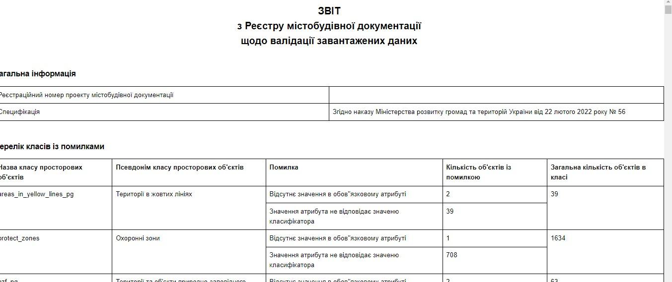 Приклад Звіту з Реєстру містобудівної документації щодо валідації завантажених даних (Рисунок 35)