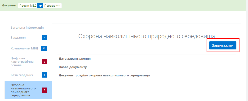Вкладка містить відомості про розділ охорони навколишнього природного середовища проекту МБД (Рисунок 36) який необхідно додати, натиснувши кнопку “Завантажити”: