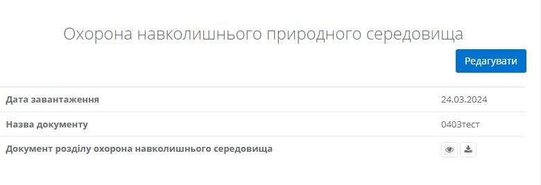 За потреби користувач може редагувати внесені відомості, натиснувши кнопку , переглянути або завантажити матеріали розділу охорони навколишнього середовища натиснувши на відповідні кнопки