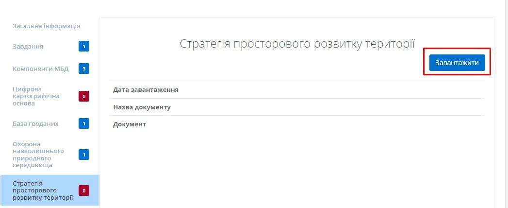 Вкладка містить відомості про розділ стратегії просторового розвитку проекту МБД (Рисунок 39) який необхідно додати, натиснувши кнопку “Завантажити”: