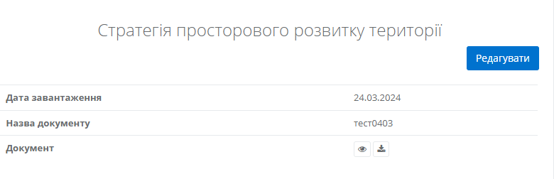 За потреби користувач може редагувати внесені відомості, натиснувши кнопку , переглянути або завантажити матеріали стратегії просторового розвитку території натиснувши на відповідні кнопки